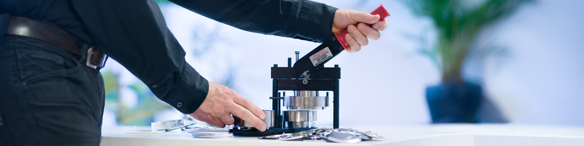 55 mm button med standard nål bak for feste i tøy m.m. Kan også leveres i alle andre størrelser eller med andre fester (magnet for feste i tøy). Ønsker du din logo på? Ta kontakt for mer informasjon
