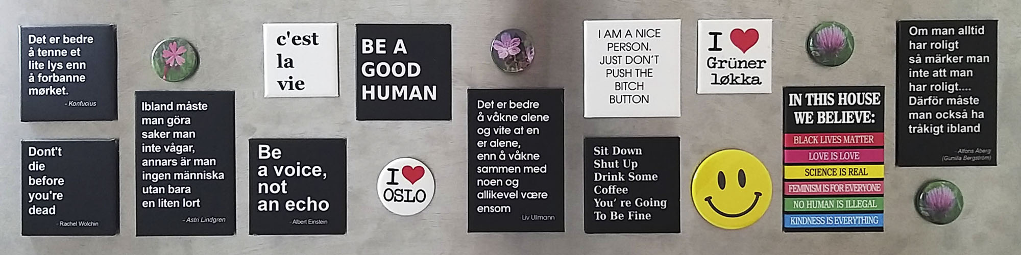 Her vil du finne et stort utvalg av kjøleskapsmagneter og buttons med ulike tekster og motiver. Alt er produsert i vårt eget verksted på Grünerløkka i Oslo. Har du en god ide på en tekst til en kjøleskapsmagnet, eller savner du en spesiell button? Send oss en e-post på post@buttonland.no Forslag som brukes vil bli premiert.